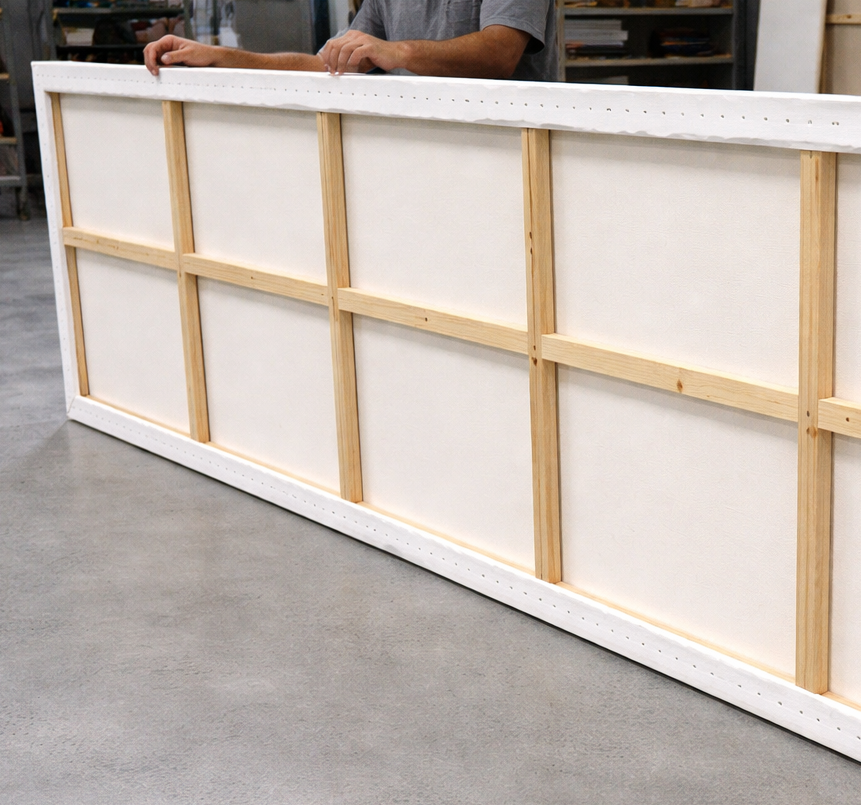 Elaboramos lienzos a la medida deseada de forma artesanal, cuidando cada detalle del proceso. Trabajamos con listones de diferente espesor y ofrecemos una amplia variedad de materiales como lino, algodón o madera de okume, montados o desmontados, sobre bastidores 3D o solamente los listones.